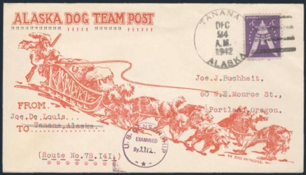 on 1942 cach ALASKA DOG TEAM MAIL cover from Tanana. Addr to Portland, Oregon & has US Censor h/s, VF (Image)