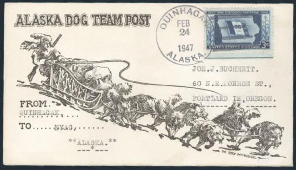 on 1947 cach ALASKA DOG TEAM MAIL cover carried from Quinhagak to Nyag. VF (Image)