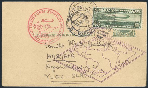by Philadelphia 31 May, 1930 duplex on uprated 1¢ green postal card, addr to MARIBOR YUGOSLAVIA (with double-ring rec cancel). Has 2 diff Zeppelin cancels and Friedrichshafen transit cancel. F. A NEAT ITEM TO AN UNUSUAL DESTINATION (Image)