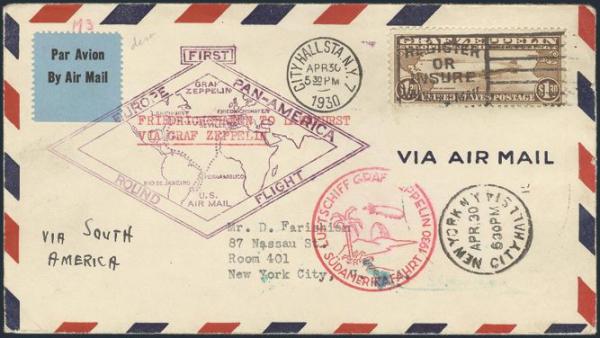 Zeppelin neatly tied by City Hall Sta NY 30 Ap, 1930 slogan cancel on South America - Pan America GRAF ZEPPELIN flight cover. Has proper cachets and green pictorial Lakehurst NJ 31 May, 1930 rec / b/s. VF (Image)