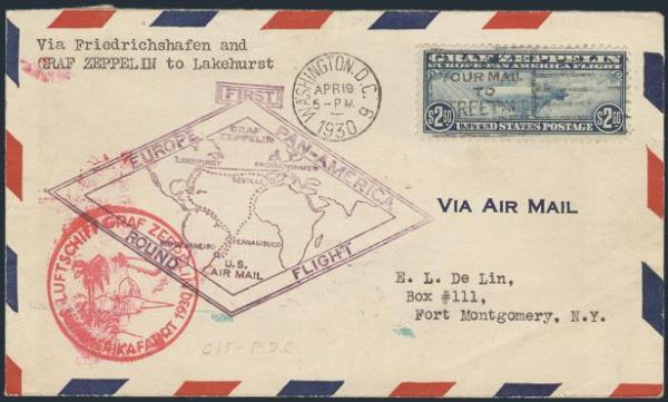 Zeppelin tied on FIRST DAY COVER from Washington DC 19 Ap, 1930 flown on GRAF ZEPPELIN South America-Pan America Flight with proper cachets and green pictorial Lakehurst NJ b/s. VF (Image)