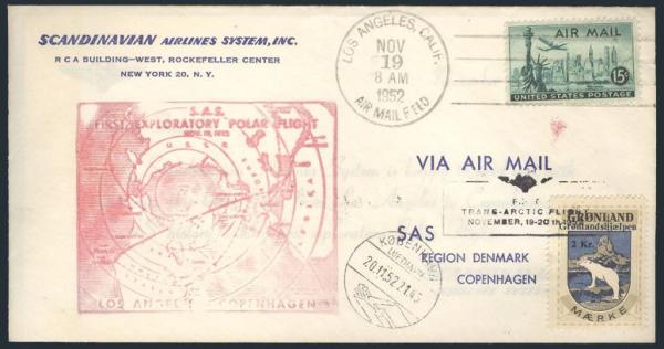 by Los Angeles 19 Nov, 1952 cancel on cacheted FIRST EXPLORATORY POLAR FLIGHT to Copenhagen. Has Greenland 2Kr local affixed & tied by special h/s. F (Image)