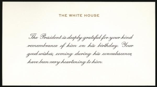 House issue tied by Denver, Colo 28 Oct 1955 cancel on cover with "WHITE HOUSE" corner card. Addr to Warren, Mass. Has matching, printed card enclosure expressing thanks re PRESIDENT EISENHOWER'S recent birthday and for speedy recovery from his heart