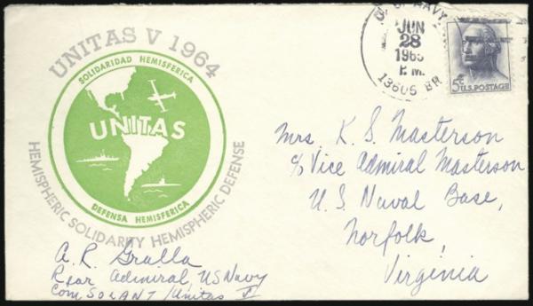 by US Navy/13606 BR 28 June 1965 cancel on UNITAS V 1964 cach special event cover to Norfolk, Va. From and signed by REAR ADMIRAL A.R. GRALLA to wife of VICE ADMIRAL K.S. MASTERSON with illustrated enclosure headed "Commander South Atlantic Force";