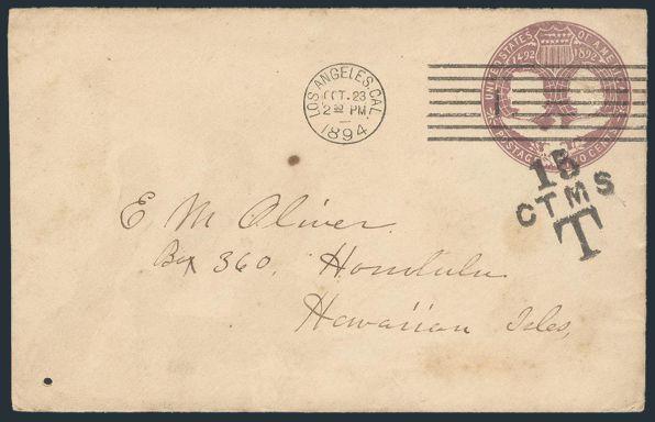 Los Angeles 23 Oct 1894 cancel underpaid to Honolulu (3 Nov b/s). Has "15/CTMS/T" postage due h/s. F, bit toned (Image)