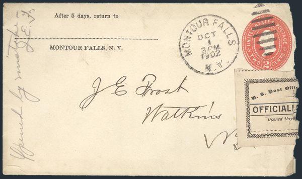Officially sealed stamp used to seal a roughly opened edge of 2¢ carmine Washington postal stat envelope cancelled by Montour Falls, NY 1 Oct, 1902. Addr to Watkins NY (rec b/s). Has pencil notation "Opened by mistake J.E.F.". Nice usage. VF. Cat