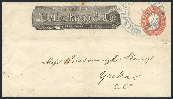 "Wells Fargo & Co. / Paid" imprint & blue 2-Ring Wells Fargo & Co. Express / S. FR Co. cancel (circa 1861). Addr to Eureka, Calif. VG-F, some bends (Image)
