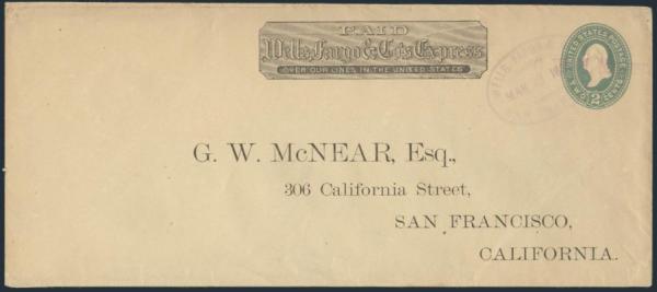 "Wells, Fargo & Co. / Paid" imprint & violet oval Wells, Fargo & Co. 29 Mar 1888 San Francisco cancel on local business reply envelope. F (Image)