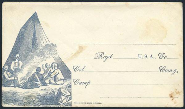 CIVIL WAR patriotic military cover with blue illustration of soldiers and a tent. Printed by King & Baird, Philadelphia. F, minor TS (Image)