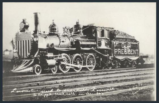 real photo postcard depicting the locomotive engine that was used to bring TEDDY ROOSEVELT to Cripple Creek, Colo in the 1890's. VF (Image)
