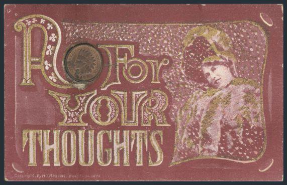 novelty postcard from 1907 entitled "A (PENNY) FOR YOUR THOUGHTS". Has a 1905 USA 1¢ Indian Head Penny affixed as part of the design of the postcard. Addr to Montreal but not mailed. F (Image)