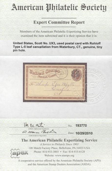 Liberty 1¢ postal card cancelled by Waterbury Ct sharp bold strike of six petal fancy leaf cancel. Has Waterbury Ct 17 Apr CDS alongside. Has 1875 dateline on reverse. VF. Has 2010 APS Certificate mentioning tiny pinhole (which we barely can see).
