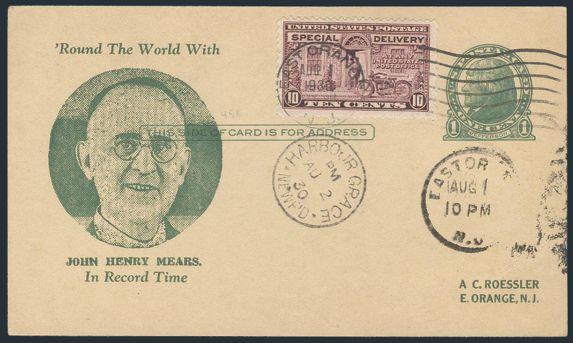 by East Orange NJ on 1¢ Jefferson Postal Stationery card with printed "ROUND THE WORLD WITH JOHN HENRY MEARS IN RECORD TIME" illustrated cachet. Mears was an American who made the record for the fastest trip around the world in both 1913 and 1928. On