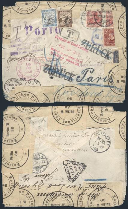 Officially Sealed stamp used on a spectacular 1908 European-size cover from Germany to USA and the returned & forwarded to Paris France. Bears USA 5¢ Postage Due, 2 diff French Postage Due stamps and many German Official Seals on all four sides. Has