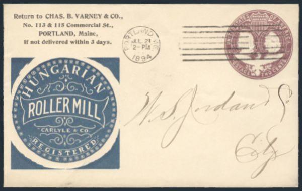 Portland, Me 21 July 1894 cancel with blue green advertising for C.H. Varney & Co. / Hungarian / Roller Mill / Carlyle & Co., addr locally. VF. An eye-catching cover!