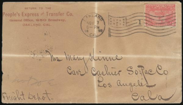 (Revenue), Tied by Oakland, Ca 7 Nov 1898 flag cancel on cover to Los Angeles. Has red "People's Express and Transfer Co./Oakland, Ca" corner card. VG+, toned. Scarce and unusual (Image)