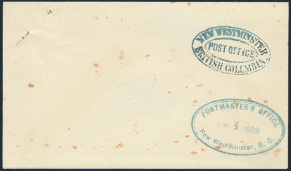 5247   imageColonial strike of NEW WESTMINSTER BRITISH COLUMBIA POST OFFICE double-ring oval handstamp in blue, on an unused envelope. Also has a blue Postmaster's Office New Westminister BC 1 Jun 1939 h/s. The Colonial oval hammer was used during 1860's & the re-discovered hammer was used to make a few favour strikes in 1939. F, minor age spots, couple pinholes (Image) Estimate 100.00+ $Cdn
