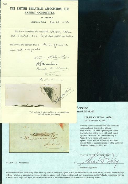 5313 12b image12b, DIAGONAL BISECT tied by grid cancel to cover to Amherst. Has b/s's from Parrsborough 10 Dec 1860 and Amherst 11 Dec 1860. F, cover has light file fold & small edge tear at top (not affecting the stamp). Has 1932 BPA Certificate & 2008 Firby Certificate. Cat $1,500 (Image) (View Certificate)