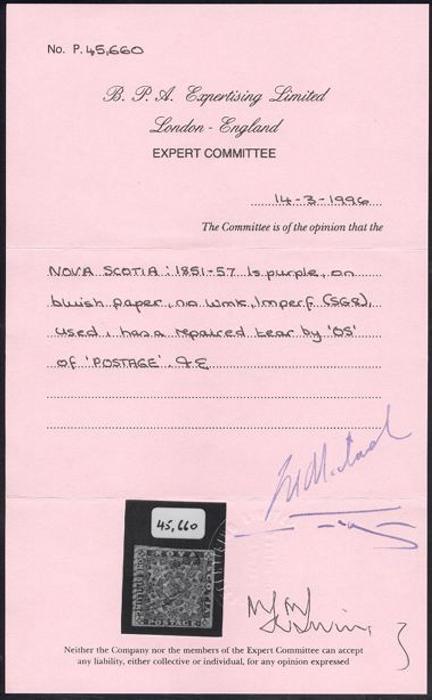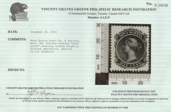 5307 8 image8, An impressive mint single with DOUBLE PRINTING effect resulting from a second "KISS PRINT" IMPRESSION. Very unusual & an essential item for a Nova Scotia or variety collection. VF, OG. Has 2016 Greene Foundation Certificate (Image) (View Certificate)