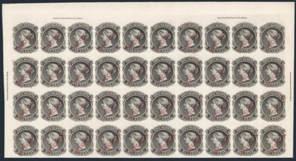 5308 8Pii, 8Piii, 8Pv image8Pii, 8Piii, 8Pv, Top margin positional Plate Proof block of 40, on card. Shows four ABNC Plate Imprints and three diff "SPECIMEN" overprint types in red (a listing of types & positions accompanies the lot). XF, one tiny pinhole. A SPECTACULAR ITEM FOR THE SPECIALIST (Image) Cat 4,640.00