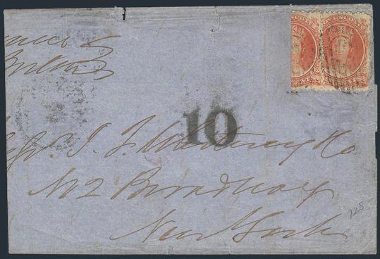 5310 10 image10, Neatly tied by oval grid cancel on 1865 cover to Gagetown (rec b/s). The reverse has 6 diff b/s's. F, a bit of back flap missing (Image) Estimate 60.00+ $Cdn