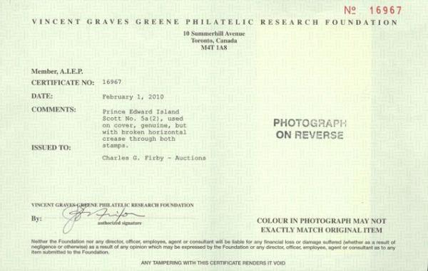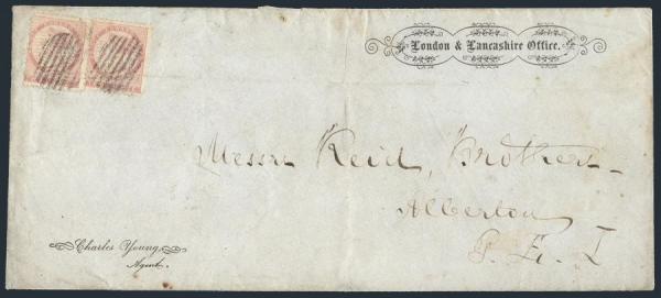 5319 5a image5a (2), Tied by grid cancels on 1867 double-rated domestic oversized cover to Alberton PEI. Has fancy "London & Lancashire Office" and "Charles Young, Agent" imprints. On reverse has PEI 3 Ju, 1867 despatch h/s. VG+, broken crease through both stamps. Has 2010 Greene Foundation Certificate. Ex Carr, Firby (Image) (View Certificate)