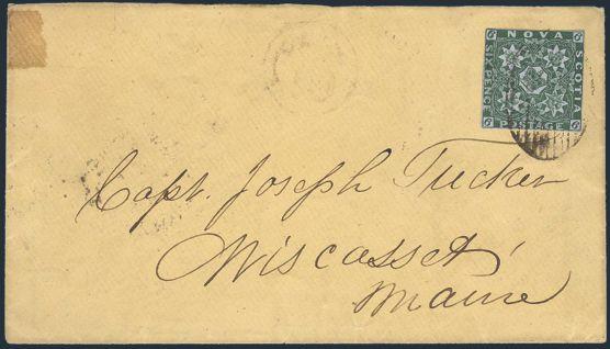 5304 5 image5, Tied by oval grid cancel on an 1860 yellow envelope from Upper Cross St. Mary's NS 2 Dec 1860 via Halifax to Wiscasset Maine. Light border PAID 10 in red h/s. F-VF. THIS IS THE LATEST RECORDED USAGE OF A SIX PENCE DARK GREEN. Ex Colchester, Tada. Cat $5,000 (Image) Estimate 2,500.00+ $Cdn
