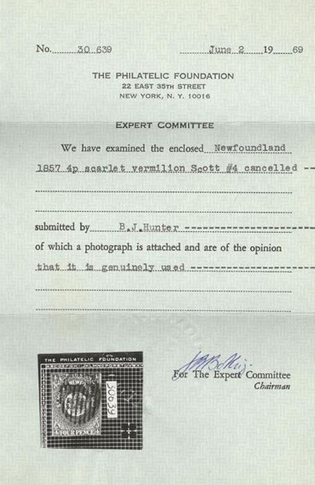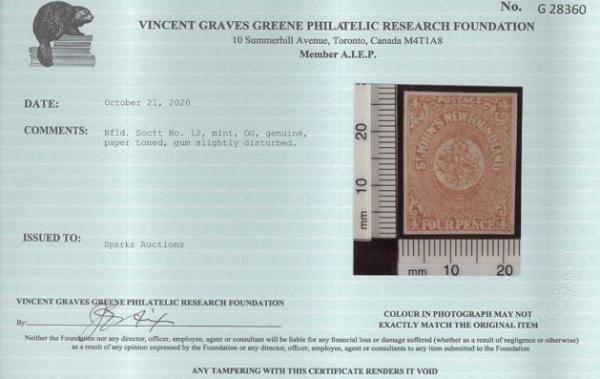 5342 12 image12, Four Pence Orange, excellent colour, four full even margins, VF, OG (minor disturbance), slightly toned paper. Has 2020 Greene Foundation Certificate. A NICE EXAMPLE OF THIS RARE STAMP (Image) (View Certificate)