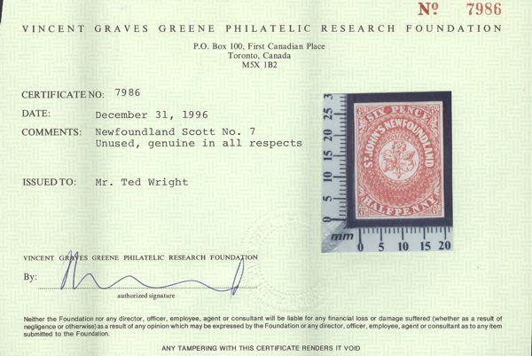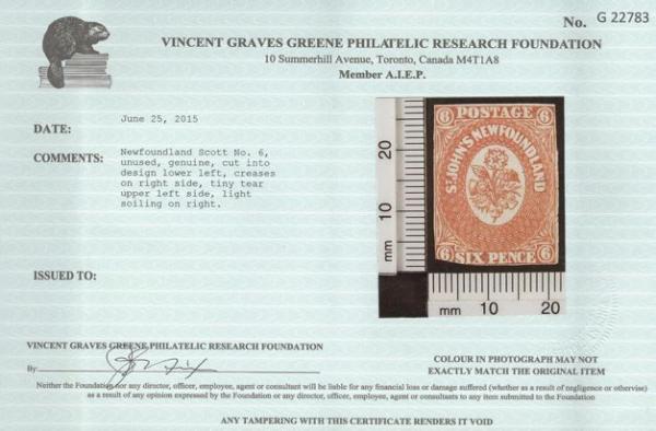 5329 6 image6, Unused Six Pence Scarlet Vermilion, VG-F appearance, some flts. Has 2015 Greene Foundation Certificate. A VERY RARE STAMP. Cat $20,000 (Image) (View Certificate)