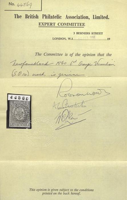 5337 9 image9, SPERATI forgery of the 1 Shilling Scarlet Vermilion. Has BPA #138 cachet handstamp on reverse. VF (Genuine stamp Cat $15,000) (Image) Estimate 400.00+ $Cdn