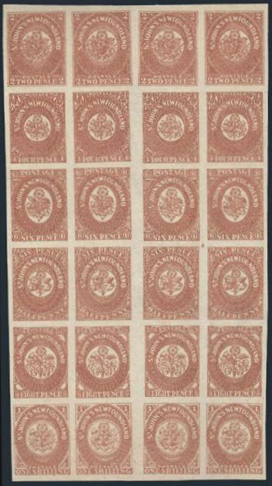 5353 17/23 image17/23, Forgery se-tenant Pence block of 24 with a wide vertical central gutter and watermark. Has 6 diff se-tenant values with 4 of each. This forgery is attributed to Oneglia. VF, ungummed (Image) Estimate 350.00+ $Cdn