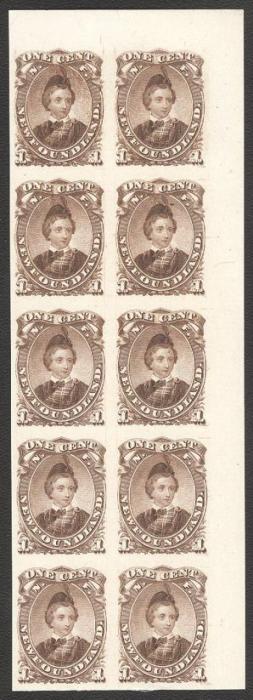 Violet Brown Trial Colour vert UR Plate Proof block of 10 on card. VF. Seldom seen in such a large multiple. A pretty showpiece (Image)