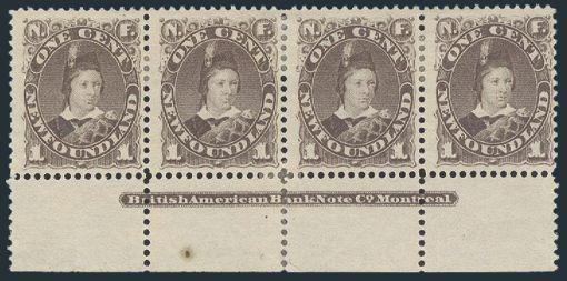 margin strip of 4 with FULL PLATE IMPRINT. F, NG, a few reinforced perfs (Cat $1,250 as a Plate Block) (Image)