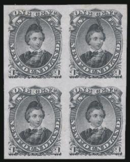 Imperf Trial colour plate proof block on India paper, in black. UR stamp has the 'white eye' variety. VF (Image)