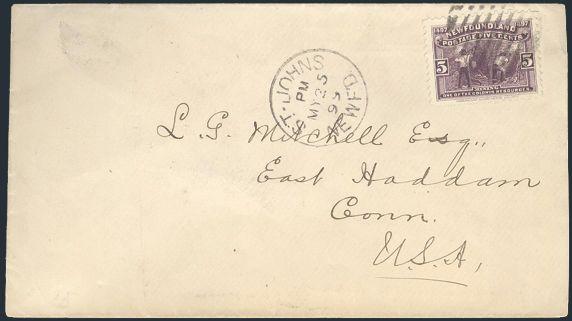 5406 65 image65, VF 5¢ Mining tied by grid cancel on cover from St. John's 25 May 1899 to USA (rec b/s's). VF (Image) Estimate 50.00+ $Cdn