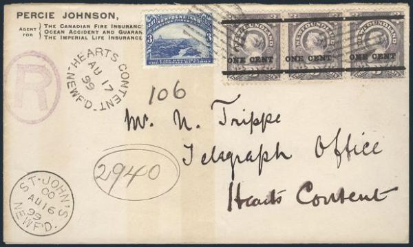 5405 63, 75 image63, 75 (3), Tied on Reg'd cover from St John's 16 Aug, 1899 to Hearts Content (split-Ring receiver 17 Aug, '99). Has corner card for Percie Johnson Insurance Agents. F, some light toning (Image) Estimate 200.00+ $Cdn