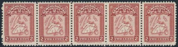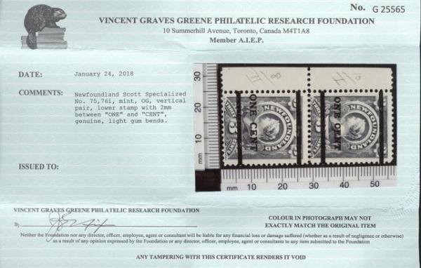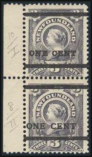 5408 75, 76i image75, 76i, Left margin vertical se-tenant pair. The top stamp Type A, lower stamp Type B with 2mm space between "ONE" & "CENT". F, light gum bends. Lovely addition to any Nfld collection. Has 2018 Greene Foundation Certificate (Image) (View Certificate)
