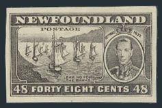 Complete 1937 Coronation set of imperforate Plate Proofs up to 48¢ in black on unwatermarked paper (the 1¢ is on blue moire-backed paper). VF (Image)