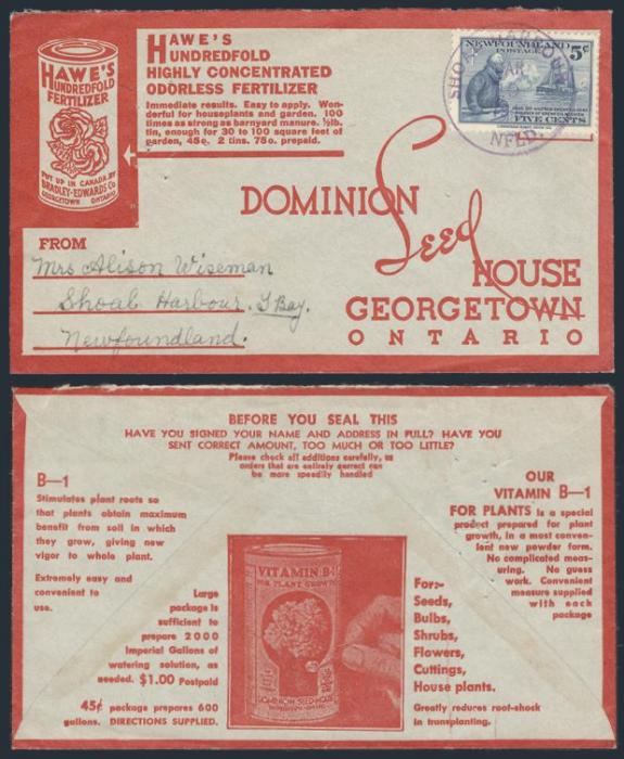 by Shoal Harbour 19 Ap, 1942 violet CDS on pretty illustrated advertising (both sides) cover, addr to Dominion Seed House in Georgetown Ont. VF (Image)