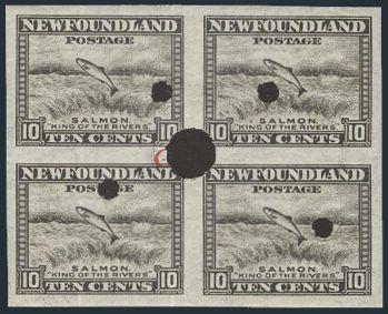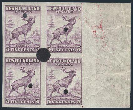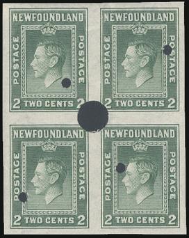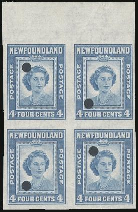Perforated and Imperf Blocks each with PRINTER'S SECURITY PUNCHES. The perforated block not listed in catalogues. VF, imperf block has NH gum (Image)
