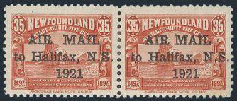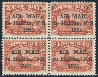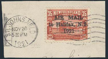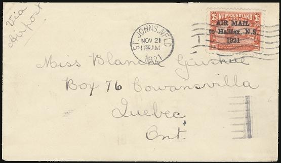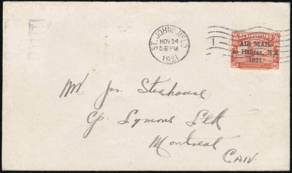 by St. John's 24 Nov 1921 machine cancel on flight cover with Halifax 4 Feb, 1922 b/s. Addr to Montreal. VF (Image)
