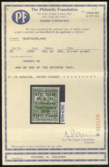 50¢ COLUMBIA FLIGHT Airmail, rich, crisp colour, pristine fresh, F-VF, NH. Has 2001 Philatelic Foundation Certificate and 2004 BPA Certificate. A RARELY SEEN STAMP ESPECIALLY IN NEVER HINGED CONDITION (Image) (View Certificate)