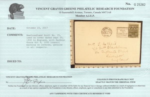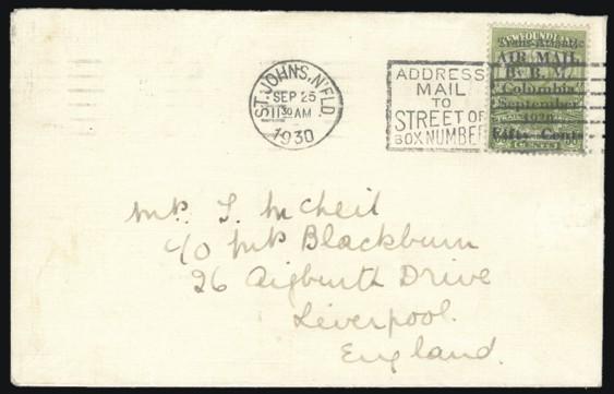 nicely centred COLUMBIA airmail stamp neatly tied by St. John's 25 Sept 1930 slogan cancel on clean cover to Liverpool England. Has Harbour Grace Newf'd 9 Oct, 1930 transit cancel on reverse. VF. Has 1972 BPA Certificate & 2017 Greene Foundation
