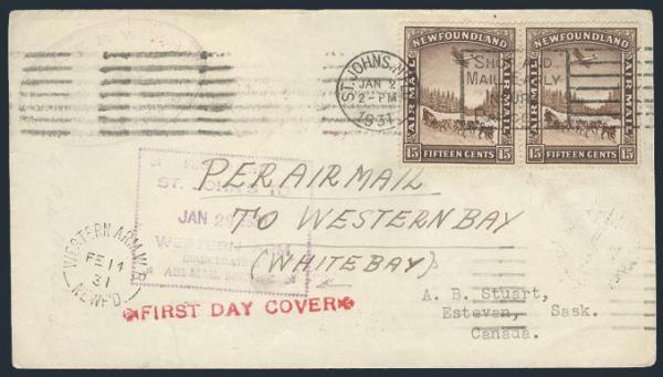 Tied by St. John's 2 Jan 1931 slogan cancel on cach FFC St. John's to Western Arm. F (Image)