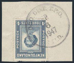 on piece by FOGO DIST. T.P.O. / NFLD 6 Sept 1947 cancel. VF (Ludlow #N-33, RF 430) (Image)