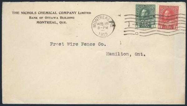 5631 109 image109, MR1, Tied by Montreal 15 April, 1915 wavy line postmark which is a FIRST DAY COVER for the MR1. Has corner card for The Nichols Chemical Co. in Montreal and addr to Hamilton Ont. F. Ex Steinhart, Lieth (Image) Estimate 200.00+ $Cdn