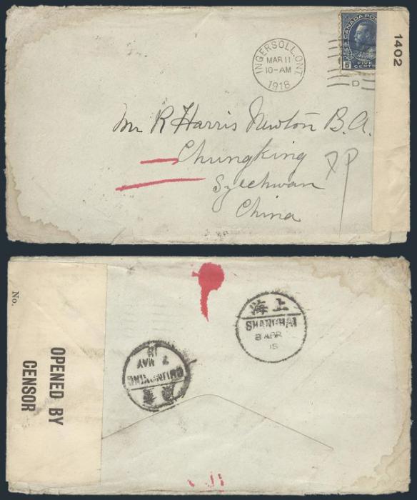 5634 111 image111, Tied by Ingersoll Ont 11 Mar, 1918 machine cancel paying the 5¢ UPU letter rate cover, addr to CHUNGKING CHINA (has Shanghai and Chungking b/s's). Has Censor tape at right. The cover took 57 days to reach Chungking. VG-F, some edge staining (Image) Estimate 150.00+ $Cdn