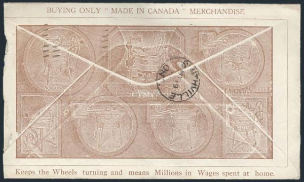 5637 125, 127 image125, 127, Two diff Admiral coils tied by Hamilton Ont 18 May 1916 machine cancel on commercial window envelope for Cummer-Dowswell Ltd. On reverse has all over illustrated advertising for BUY ONLY MADE IN CANADA MERCHANDISE. Addr to Smithville Ont with original contents. F, a bit reduced at right (Image) Estimate 65.00+ $Cdn