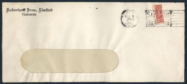 5649 181 image181, BISECT of 2¢ KGV Arch coil tied by Toronto 5 Mar 1931 slogan cancel on #10 size commercial window envelope. Scarce unauthorized bisect usage. F, small flaws (Image) Estimate 125.00+ $Cdn