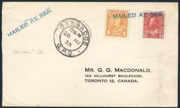 5638 132, 162 image132, 162, Tied by blue MAILED AT SEA straightline on cover with Barbados 28 Aug 1933 CDS alongside. Addr to Toronto. F (Image) Estimate 60.00+ $Cdn